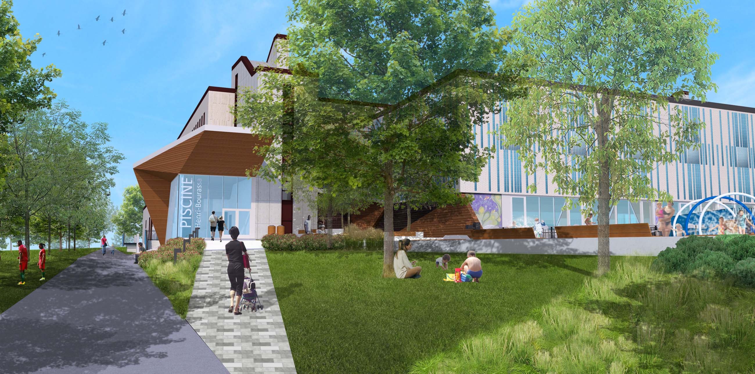 La rénovation de la piscine de l’école Henri-Bourassa conçue par l’architecte Louis J.Lapierre en 1973 est une opportunité de créer un centre aquatique polyvalent pour les citoyens de Montréal-Nord. Dans le cadre du réaménagement du parc Henri-Bourassa, l’arrondissement souhaite l’ajout d’installations aquatiques extérieures. L’enjeu du projet est de moderniser la piscine tout en lui créant une identité visuelle.