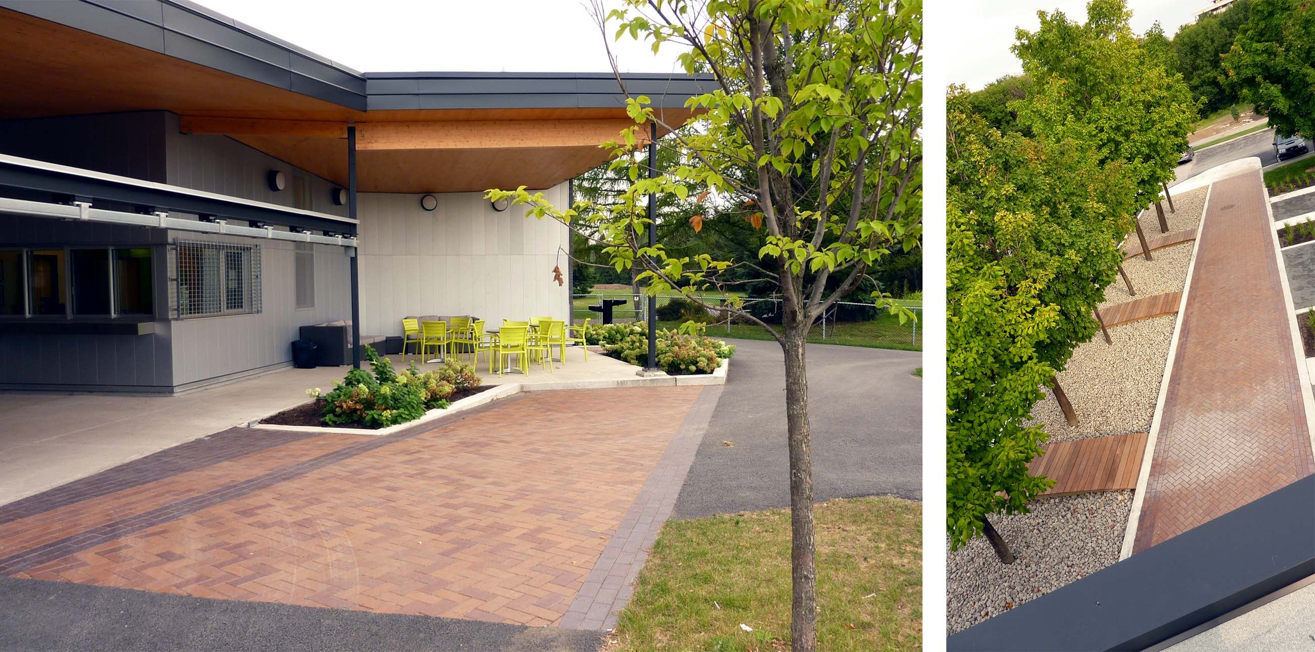 Les aménagements proposés suivent cet objectif en étant conçus avec des végétaux reconnus pour leurs caractéristiques paysagères tout en offrant une excellente durabilité et une grande tolérance à la sécheresse. Le drainage des surfaces dures du projet est, par ailleurs assurée par des systèmes favorisant une infiltration des eaux de ruissellement dans le sol plutôt que de les rediriger directement dans le réseau d’égout pluvial de la ville.